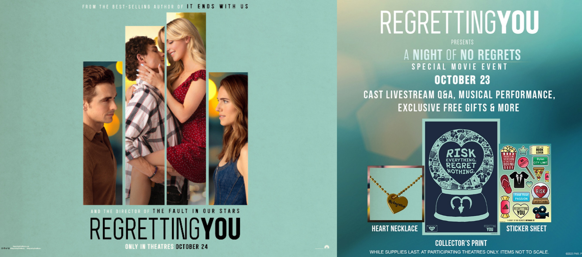Ticketholders seeing REGRETTING YOU: A Night of No Regrets at the Opening Night Fan Event will also see additional bonus content and will receive exclusive merchandise including a heart charm necklace with “No Regrets” inscription by star Mckenna Grace, 12”x18” collector's art print and 5” x 7” custom sticker pack created for fans attending this one-night event – while supplies last.